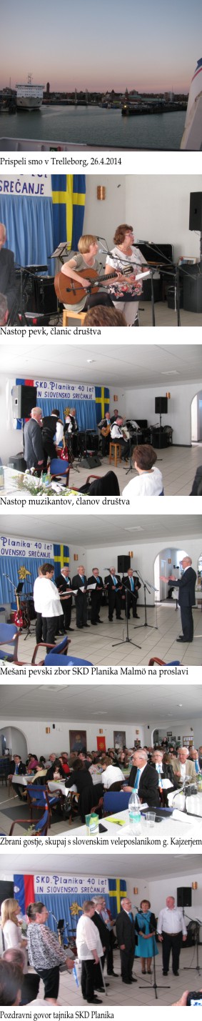 Na povabilo Slovenskega kulturnega društva Planika Malmö smo se člani ansambla Razum zadnji vikend v aprilu mudili na obisku pri naših rojakih na Švedskem. Slovensko kulturno društvo Planika Malmö je praznovalo 40. obletnico svojega uspešnega delovanja. Na prireditev, ki je bila dne 26. aprila 2014, je bilo povabljenih okrog 120 gostov. Navzoči so bili predstavniki vseh slovenskih društev, ki delujejo na Švedskem, del članstva, tudi še živeči ustanovni član društva in slovenski veleposlanik za skandinavske in baltske države na Danskem g. Tone Kajzer s svojo družino. Prireditev ni bila posvečena samo 40. obletnici društva Planika, ampak je bila namenjena tudi srečanju in druženju vseh Slovencev, ki živijo in delajo na Švedskem. Predsednica društva Ivanka Franseus je uvodoma poudarila, da je društvo središče druženja vseh Slovencev, živečih v Malmu in daje pomemben prispevek k ohranjanju slovenske besede in kulture na Švedskem. Ob vsakem okroglem jubileju, ki se ga v Malmu živeči Slovenci zelo veselijo, povabijo medse ansambel iz rodne Slovenije. Tako so ob 35. obletnici društva na Švedskem gostovali Akordi, letos, ob okroglem 40. letnem jubileju, pa je bil povabljen na Švedsko naš ansambel Razum. Sam obisk je bil skrbno načrtovan, za kar gre zahvala tajniku društva g. Jožefu Ficku, ki je po rodu Ptujčan in že vrsto let živi v Malmu. Obisk sva načrtovala že od meseca maja lani, ko je bil g. Ficko na obisku pri sorodnikih na Ptuju in sva se medtem tudi srečala in osebno spoznala. Za naš sprejem na Švedskem in za vodenje po Malmu je bil zadolžen g. Rudi Belec, po rodu iz Železnih Dveri pri Ljutomeru, ki tudi že skoraj 40 let biva in dela v Malmu. Soboto dopoldan smo izkoristili za ogled znamenitosti samega mesta, kjer izstopa stanovanjska stolpnica, ki je okrogle oblike in v vsakem nadstropju nekoliko zasukana v levo. Je tudi najvišja stavba v tem delu Švedske. Ogledali smo si tudi dvoetažni most, ki povezuje Malmö s Kopenhagnom (Danska) in je v obe smeri možno potovati tako po železnici, kakor tudi po cesti. V starem delu Malma smo si ogledali mestno hišo, tržnico in za to območje značilne stavbe, ki so izdelane iz nosilne lesene konstrukcije, stene pa so potem zapolnjene z opečni zidaki. Tako les, kot tudi opeka sta dobro zaščitena, tako da bosta še dolgo kljubovala zobu časa. Slovesnost ob 40. obletnici delovanja Slovenskega kulturnega društva Planika Malmö se je odvijala v veliki dvorani makedonskega kulturnega centra, na drugem koncu mesta. V samem kulturnem delu so nastopili člani društva, ki premore mešani pevski zbor in tudi kar nekaj glasbenikov, ki so posebej za to prireditev spet vzeli instrumente v roke, zaigrali in tudi zapeli. Navzoče goste je nagovoril tudi veleposlanik Republike Slovenije za skandinavske države g. Tone Kajzer, ki je med drugim izpostavil tudi zasluge društva za ohranjanje slovenske kulture in vezi med Slovenci na Švedskem in v matični domovini. Mi smo nastopili z Avsenikovo skladbo Slovenija, od kod lepote tvoje. Na koncu smo si izmenjali še spominska darila. V zabavnem delu, ki je sledil kulturnemu, smo odigrali nekaj zimzelenih Slakovih in Avsenikovih melodij, kakor tudi nekaj novejših narodnozabavnih in zabavnih skladb in moram povedati, da zahvaljujoč svetovnemu spletu, Slovenci, živeči na Švedskem, našo novejšo glasbo zelo dobro poznajo. Seveda tudi tukaj brez skladbe Ti moja rožica ni šlo in skoraj vsi, predvsem mladi, poznajo besedilo in so z nami tudi peli. Nepozabno doživetje. Zaključili smo, tako kot se spodobi, z Avsenikovo polko Na Golici. Gostje so plesali od začetka pa vse do konca prireditve. Odmore med nastopom smo izkoristili za srečanja in navezavo stikov s predstavniki ostalih slovenskih društev na Švedskem. Sam sem se srečal tudi s slovenskim veleposlanikom g. Tonetom Kajzerjem in govorila sva tudi o gostovanju našega ansambla na Danskem. Ko takole analiziram vtise z našega gostovanja pri rojakih na Švedskem, mi je razen prireditve, najbolj ostal v spominu prisrčen sprejem v njihovih društvenih prostorih v petek 25. aprila zvečer. Sprejem je bil res posebno doživetje. Bil je poln emocij, stiskov rok in objemanj in takoj sem dobil občutek, da smo tukaj zelo zaželeni in da so nas Slovenci v Malmu že težko pričakovali. Že med samim potovanjem v Malmö smo si izmenjali kar nekaj SMS sporočil, tako da so vedeli, kje približno se nahajamo. Slovenske žene so pripravile večerjo na tradicionalni slovenski način: svinjska pečenka, restani krompir in solata. Po večerji je naš harmonikar vzel v roke svojo frajtonarco in v Malmu je zadonela slovenska pesem. Neprecenljivo. Tudi odhajali smo s težkimi srci. V imenu ansambla Razum sem se jim zahvalil za povabilo in gostoljubje. Obljubili smo si, da ohranimo vezi in da se še kdaj srečamo ob kakšni podobni priložnosti.